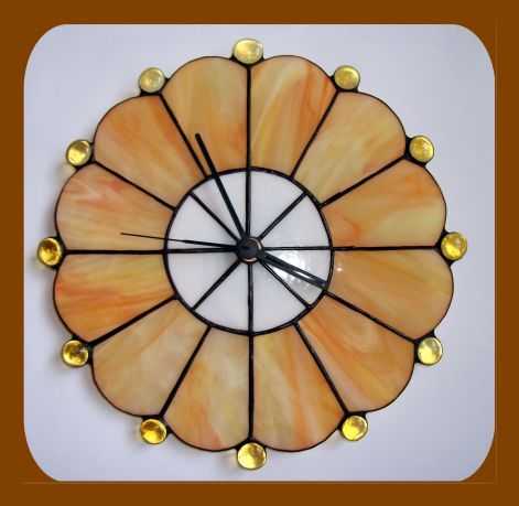 Fehér-narancs, színes spectrum üvegek és vörös, narancs lámpagyöngyök felhasználásával készült a falióra, tiffany technikával. Átmérője 27cm, 38db-ból áll, melyek formája virágszerű motívumot formáz. A különleges színösszeállítás, anyag felhasználás és a forma igazán mutatós lakberendezési tárggyá és időmérővé teszi az órát. Csendes, minőségi, német szerkezettel szerelt mely ceruzaelemmel működik.
