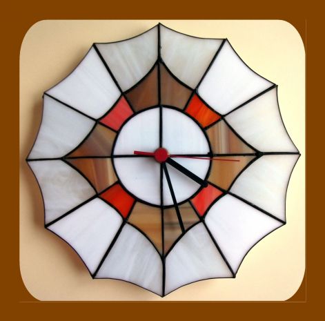Tiffany technikával készült falióra, melynek átmérője 28cm. Az óra 28 üvegdarabból áll, melyek különleges elrendezése pókhálót formáz. Három szín (szürkésfehér, narancs, világos barna) felhasználásával készült, de a domináns fehér miatt nagyon szép világos összhatást kelt. Az óraszerkezet ceruza elemmel működik
